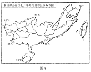 4、单选题 读图8“我国部分省区七月平均气温分布图”,回答题。