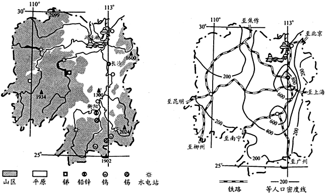 (3)影响工业的区位因素主要有原料、动力、技术、市场、劳动力、交通、政策等,结合湖南省的矿产、交通、人口分布图进行分析。由湖南省地形、矿产图可知该省有丰富的锑、铅锌(钨、锡)等有色金属矿产资源;有色金属冶炼工业属于动力指向型工业,湖南省河流众多,水资源丰富;而且河流落差大,水能资源丰富,为发展有色金属冶炼提供充足的能源;由湖南省交通、人口图可知该省有京广、焦柳、沪昆等铁路经过,交通发达;人口稠密,劳动力资源丰富。