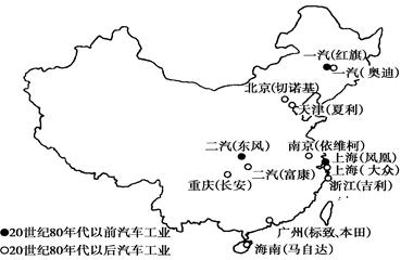 1、综合题  中国汽车工业协会公布的最新数据,2009年我国国产汽车产销分别为1 379.10万辆和1 364.48万辆,而2009年美国汽车销量仅为1 043万辆,这意味着我国首次超越美国,成为世界汽车产销第一大国。结合我国的汽车产业分布变化图,回答下列问题。