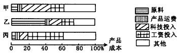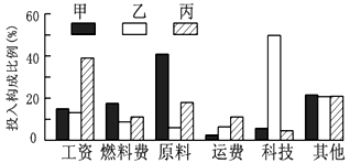3、单选题 下图中甲、乙、丙反映了三类工厂的投入构成情况,读图回答下列各题。