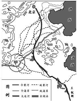 (1)甲虚线框内为何种地貌类型?为什么会成为历史上黄河改道时溃堤决口的集中区域?(5分)
