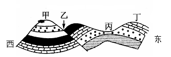 小题2:背斜储油向斜蓄水,所以富含石油和天然气的构造属于背斜构造,在甲、乙、丙、丁四个选项中,只有丙处为背斜的顶部,开采油气最适合,选项C正确。