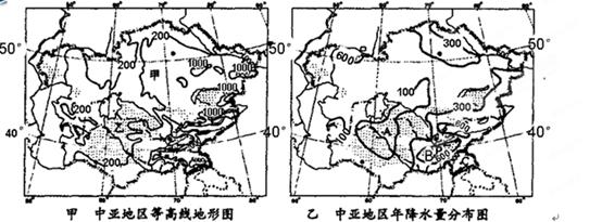 2013年9月3日至13日,国家主席习近平对中亚四国进行国事访问,出席二十国集团领导人第八次峰会和上海合作组织成员国元首理事会第十三次会议,受到国际社会高度关注。此访全面提升了中国与中亚四国的双边关系,对完善全球经济治理以及推动上合组织健康务实发展具有重要意义。读甲、乙两图分析回答下列问题。