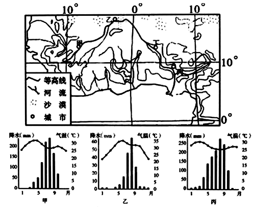 2、综合题  图为世界某区域图和甲、乙、丙三地气候资料(气温曲线、降水柱状)。读图完成问题。(14分)