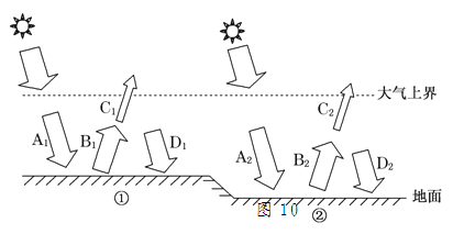3、单选题 读“地球表面受热过程示意图10”( 图中,①②两地纬度相同,海陆位置相近,各箭头表示不同的辐射形式),读图回答题。