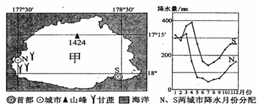 图中甲岛是太平洋的一个火山岛,经济以农业为主,S市是该岛最大的城市,人口约20万(全岛约70万)。甘蔗制糖业是该岛最主要的支柱产业,蔗糖70%以上远销欧洲。2008年该岛甘蔗每公顷产量为45.89吨(我国为71.23吨)。