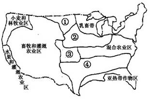 小题2:图示反映美国农业生产的地域分工,即农业生产形成地区专门化生产。