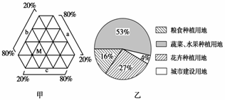 2、单选题 图甲中M点表示我国某县2010年农产品产值构成(其中a表示花卉,b表示蔬菜、水果,c表示粮食);图乙为该县“十二五”农业土地规划,读图回答问题。