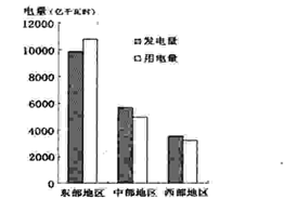 材料三: 2003年我国东、中、西部发电量和用电量柱状图。