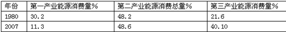(1)根据材料一分析:我国三大产业能源消费增长最多的是第____________产业(2分),在国内生产总值中所占比重升幅最大的是____________产业(2分)。
