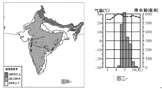 材料一?图甲为印度地形示意图,印度大部分地区气候特征如图乙所示。