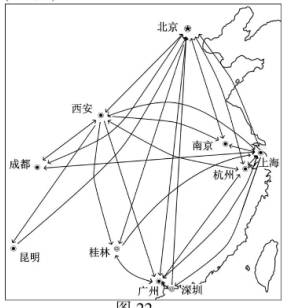 3、综合题 [旅游地理] 下图是中国部分重点旅游城市欧美入境旅游联系图,箭头指向表示境外游客在某城市旅游后的流向。读图回答下列问题。(10分)