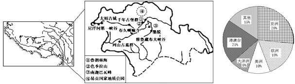 5、综合题 旅游地理 读林芝位置、林芝旅游资源分布、林芝入境客源结构构成示意图,完成下列要求。(10分)
