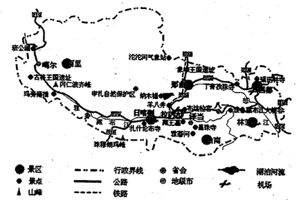 根据图中的注记可知,图示区域是西藏自治区。西藏地区位于青藏高原上,旅游资源独特,集群条件好,地域组合好,游览价值高。随着铁路、公路和航空等交通方式的快速发展,运输便利,游客集散方便。由于国家政策、资金的支持,该地基础设施建设进一步完善,地区接待能力大幅提高。社会环境稳定,我国经济发展快,个人收入提高,人们旅游活动欲望增强。