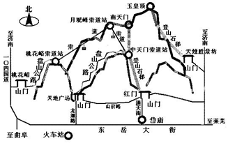 3、综合题 (11分)泰山是我国著名的风景名山,号称五岳之首。其旭日东升、晚霞夕照、黄河金带、云海玉盘被誉为四大奇观。下图为泰山旅游线路示意图,读图回答下列问题: