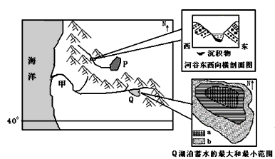 1、单选题 ? 下图为某区域图,图中右侧分别表示乙河流局部河谷剖面示意图和Q湖不同季节的蓄水面积分布图,读图回答1—2题。