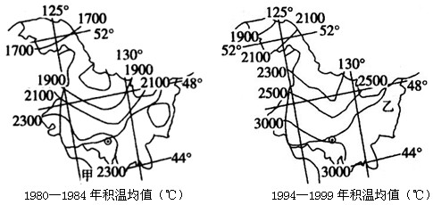 1、综合题  农业上一般认为,≥10℃积温(全年连续≥10℃日均温之和)2000℃等温线代表了种植水稻所需的最低积温线,积温达2300℃时,水稻可以稳定生长。读黑龙江省1980~1984年和1994~1999年积温均值示意图,回答下列问题。