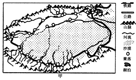 3、单选题 塔里木盆地的四周是由冰雪融水补给的河流冲积而成的冲积扇,绿洲就在冲积扇的中下部。这些地区人口集中,农牧业较为发达,交通便捷。下图图甲为塔里木盆地城镇分布示意图,图乙为该区域某处地形剖面图。据此回答1~2题。