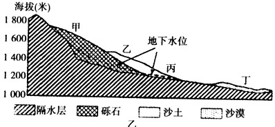 2、下图甲乙丙丁四地中,绿洲应分布在