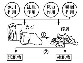 小题1:由图中信息可以判断,从岩石到碎屑物主要是风化作用;从残积物到沉积物,主要是搬运作用。正确答案选A。
