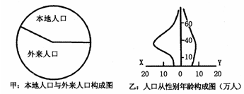 5、单选题 读“外来人口与本地人口构成图”和“人口性别与年龄构成图”,回答下列各题。