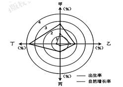 1、单选题 下图为某国在甲乙丙丁四个不同时期的人口增长模式示意图。完成题。