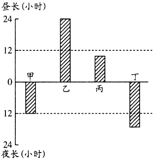 3、单选题  读某日甲、乙、丙、丁四地的昼长或夜长示意图,回答1~2题。