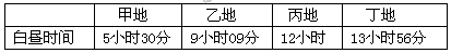 4、单选题  下表中所列的是12月22日甲、乙、丙、丁四地的白昼时间,根据表中数据回答1—2题。