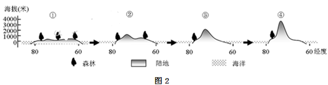 2、单选题 图为某大陆沿45°纬度在地质历史时期从古至今的四个阶段的地形剖面示意图。读图回答7~8各题。