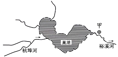材料一 :巢湖上游支流杭埠河发源于大别山区,经巢湖由裕溪河注入长江。下图为 巢湖流域水系局部图