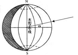 2、综合题 图中,太阳光线和赤道平面的夹角a=21°,阴影部分和非阴影部分表示不同的两个日期,分别是6月30日和7月1日。(10分)