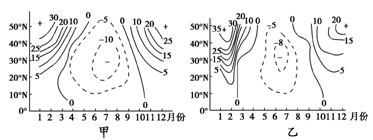 1.图中极值中心形成的主要原因是2.图乙所示年份的下半年,冬、夏季风势力与多年平均状况相比