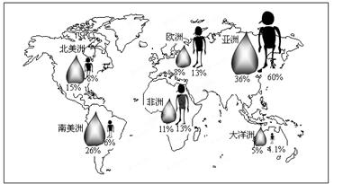 3、单选题 水是地球上分布最广泛的资源,但地球上的水只有2.53%是淡水。该图是地球上可利用的淡水资源分布和人口资源分布示意图,图中数值分别表示各大洲淡水资源、人口数量占世界总数的百分比,读图回答问题。