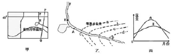 2、单选题  甲图中的河流径流量季节变化大,乙图是甲图中的对应河段及其附近的等潜水位线图,丙图中的年径流量曲线图是乙图中A、E两处测得的,读图回答下列各题。