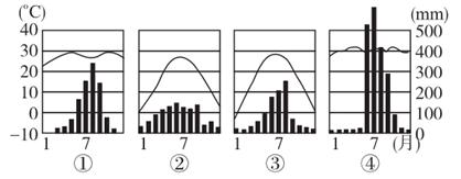 从图中可知①气温始终高于20℃为热带,降水集中5-10月,热带草原气候,②气温始终高于0℃为亚热带,降水集中夏季,为亚热带季风气候,③气温最低月低于0℃为温带,降水集中夏季,为温带季风气候,④气温始终高于20℃为热带,降水集中6-9月为热带季风气候。季风气候中温带与亚热带季风气候为海陆热力性质差异影响形成,热带季风气候除海陆热力性质差异影响以外还有气压带风带的季节移动引起(夏季风)。B对。