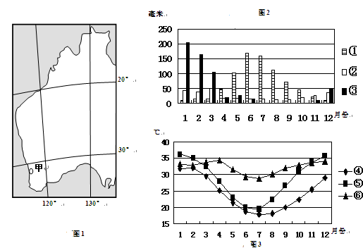 1.甲地月降水量与月最高气温,正确的组合是2.7月控制甲地主要的气压带或风带是