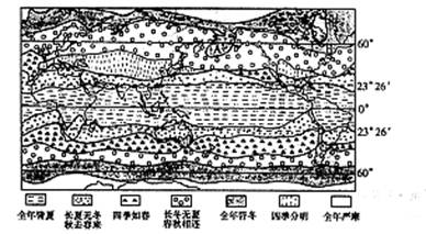 5、单选题 下图为接连续五日平均气温划分的“世界四季类型分布图”。读图回答下列问题。