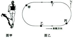 小题1:该地位于江苏省某市(34°N,117°E)→北回归线以北;其身影向正北→为当地中午,太阳位于正南;图甲中某运动员身影在其斜前方→说明在朝偏北方向(东北方向)跑,符合此条件的四地中只有丙,图示时刻甲身影位于其斜后,乙身影位于其正左侧,丁身影位于其正右侧,选 C项。