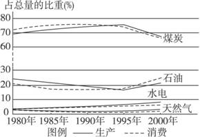 1.在此期间,能源生产与消费的变化为2.2000年消费量超过生产量20%以上的能源种类有3.我国目前