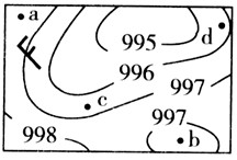 5、单选题 下图是某地近地面等压线分布图,图中画有风向符号。据此完成1~3题。