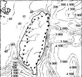 1、综合题 ? 2008年12月15日台海两岸直接三通全面启动,两岸交流掀开了历史新页。阅读台湾岛附近海水等深线图,回答下列问题。