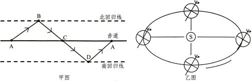 3、综合题 读太阳直射点移动轨迹图(甲)和地球公转示意图(乙),完成下列要求:(13分)