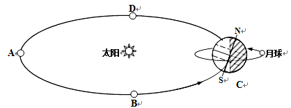 5、综合题 (14分) 读天体系统示意图,字母A、B、C、D表示地球绕日公转的二分二至日,C位置图示是地球在12月22日的光照图;箭头表示公转方向,读图回答下列各题。