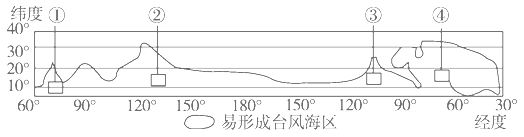 (1)影响美国的飓风主要形成于大西洋洋面,根据经度判断应是④区域。台风是强烈发展的热带气旋,是低压中心。台风中心附近的风力最大。所以台风过境前后,气压先降低后升高,风速先增大后减小。