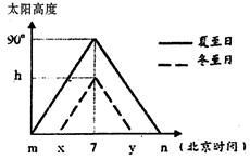 【小题3】中间添一条春秋二分日的太阳高度线,则日落时间为13时;则n-13=13-y;故计算得B项正确。