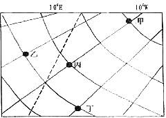 【小题1】根据图中经度位置可知,该地是以南极点为中心的光照图,甲地位于丁地的南面;甲地位于10°W,丁地位于20°W,则甲地位于丁地的东面。