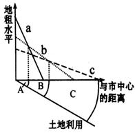 经济因素是城市功能分区的主要因素。故土体利用于哪类经济活动取决于经济效益(付租能力的高低)。距离市中心越近地价越高,交通便利地价高。市中心的经济活动地租水平高。市中心适合商业区的布局,付租水平最高,根据各项经济活动付租能力的水平的变化,哪项经济活动的付租水平最高,则选择哪种经济活动。故A区域商业的付租能力最高,形成商业区;B区域住宅的付租能力最高,形成住宅区,C区域工业的付租能力最高,形成工业区。