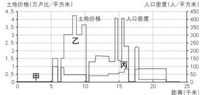 1.甲地区土地价格和人口密度均很低,原因是?