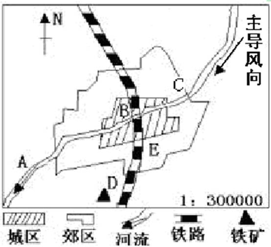 (2)若从A、B、C、D、E五处中选建自来水厂和钢铁厂,则自来水厂最适合建在____处,理由 ___________________________。(2分)