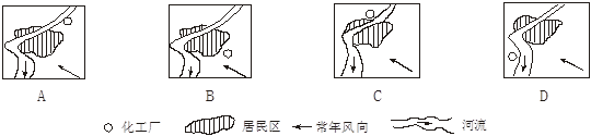 5、单选题 如图,某城市规划建设一个化工厂,下面四种布局较合理的方案是(?)